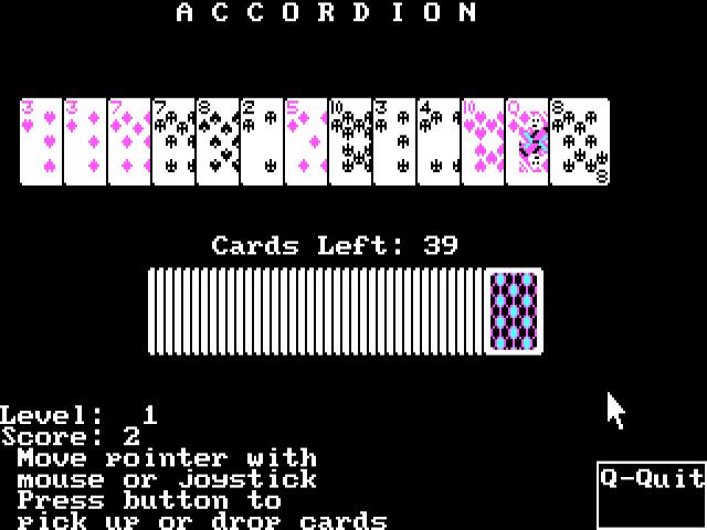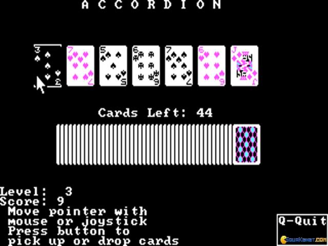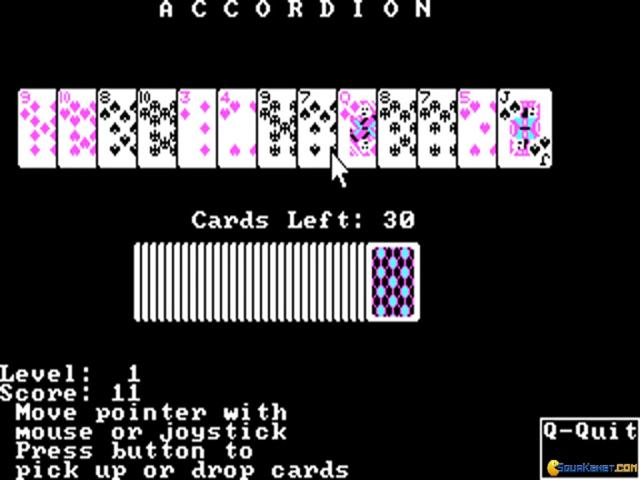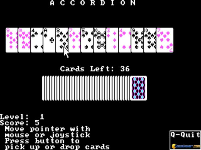 Accordion is a proper, well produced Solitaire variation whose original idea is that the cards all comes in one single row, and, as the bellows of an accordion, you have to organize them in ascending order of their value. You can play against a timer, or in order to complete the game in as few moves as possible; also, another option that also makes sense in Accordion is that you can mix these two modes, but that's recommended only after you've learned the game a little. Graphically, Accordion is pretty decent, simple, classic, 8bit DOS, and that can be enough for most players. You might feel that the animations could have been a little more lively, but then again, since it works, and works properly, I don't think you'll mind it. Plus, graphically, Accordion shows its age pretty well, so, with that in mind, I think that no one would expect anything other than what Accordion offers! Else, another good card game is Ante-Up at the Friday Night Poker Club, a cool poker game, a bit more developed graphically, which is why it's definitely worth looking into. But none of these games will disappoint, of that you can be sure.