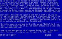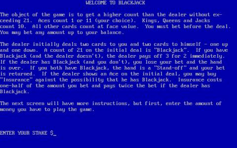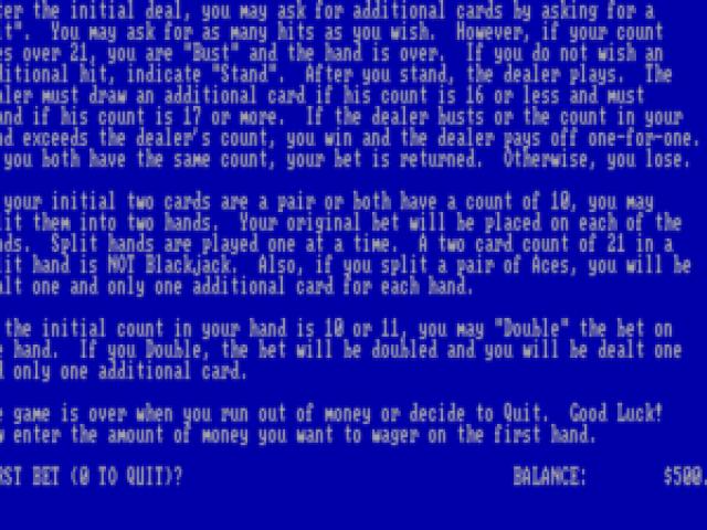Released in the middle of the 80s, this blackjack sim offers just enough to keep you playing, you have your cards, the cards of the dealer and your betting console. Feel lucky, ask another card. Want to withdraw? Noting simpler, just press the right button. Graphically, the game is quite simple, with crude looking cards, and a black background. But, overall, the game is ok, and the odds also do not feel tilted in your favor. You might have wanted to use this sim to learn the game, back in the day, but today, with so many online options, some in which you can even bet real money, this game offers little to entice you to keep playing. At any rate, you do not feel as if you have any reason to play this, while at the same time, the game, for its time period, offered more than enough to keep you ensnared. So, why play it? Well, either because you might have played it in the past and have a need to return to your old classic, or, maybe, you feel like you need to explore the card sims developed in the past. Either way, BlackJack will offer itself, heart on its sleeves, simple, no bells, no whistles, just a crude sim game of blackjack, playable but not too appealing either