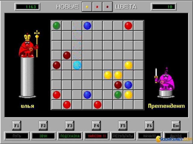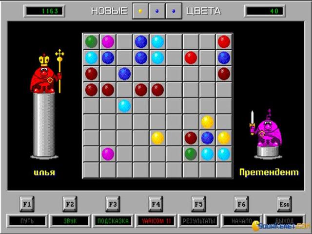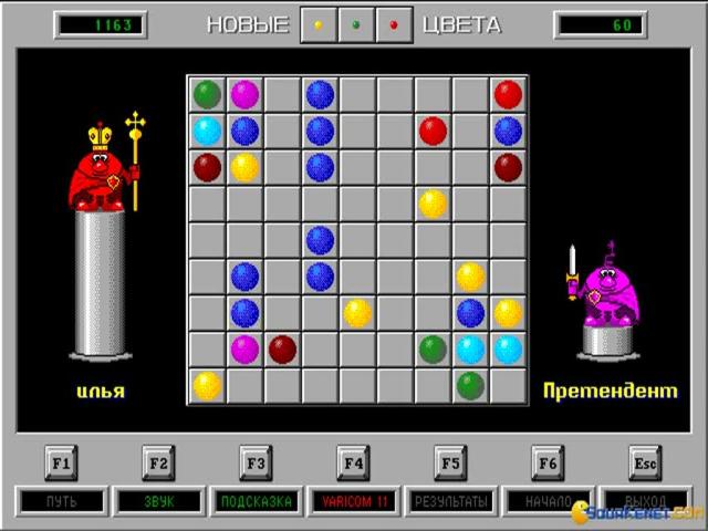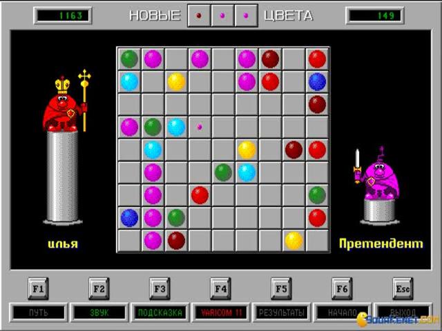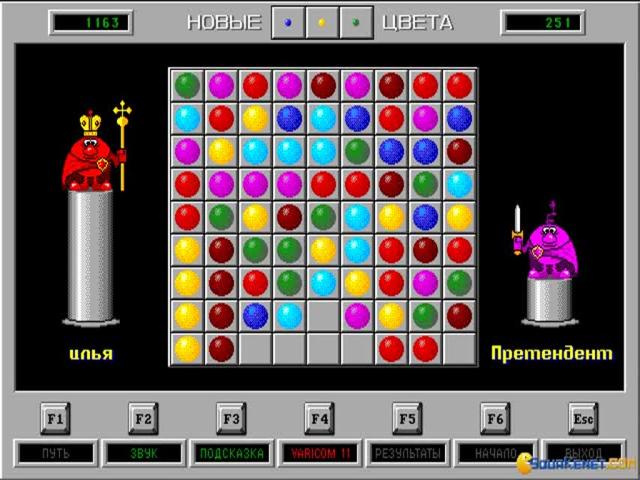 An unusual diversion, Color Lines is one of those games that will appeal to puzzle fans who value exercising their minds rather than their trigger fingers. Hailing from Russia, like its spiritual predecessor Tetris, Color Lines shares that classic's simple approach to puzzling, requiring players to build lines of five balls, each of the same colour. Unlike Tetris, Color Lines is played against the computer, with alternating turns where each player moves one ball across a 9 x 9 grid into the desired location. Moves can only be made if there is a clear path and if a line of 5 is made, then those balls disappear, adding to the player's score and giving them another turn. If a line is not created then three new balls are added, with the game proceeding until the board is empty. It is straightforward enough to pick up and play, with simple rules, but requires advance planning and thinking to defeat a highly challenging AI. Although no one plays these games for their graphics, some effort have been made to introduce personality through the player characters which adorn the screen, while the clean, uncluttered interface and bright colours render the game visually appealing and easy to play. Like the best puzzle games, Color Lines is addictive and simple to learn, yet difficult to master and fans of Pipe Dreams or Wetrix are sure to adore it.