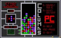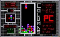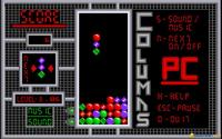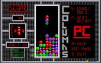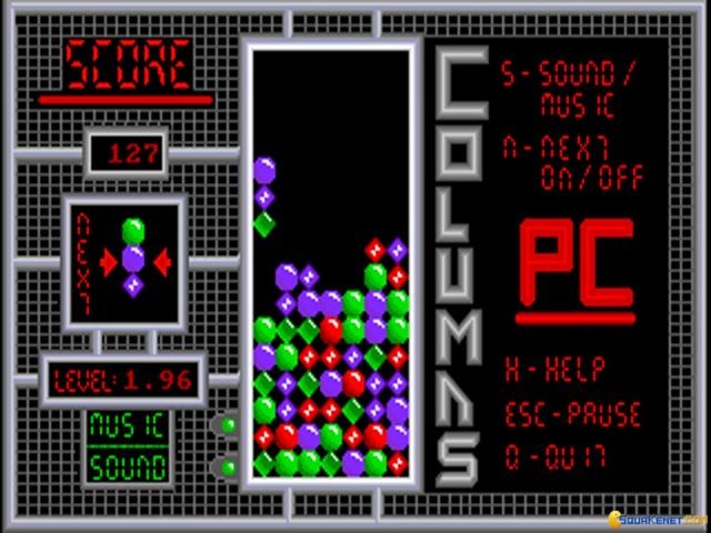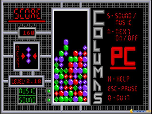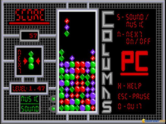 Columns is an shuffling and arranging kind of puzzle, where your main goal is to stack the falling blocks of gems in such a manner as to have a continuous set of at least 4 gems of the same color, either sideways, vertically or diagonally. At times you get special gem blocks, which, as in Tetris, fall at random from the upper portion of the screen. These have different properties, but the idea is that they generally can cut through your blocks, and if you arrange them smartly, depending on the gem configuration where they fall, you can make more than just one block of gems disappear. Each level of the game has a different speed and also, the later on have more special blocks falling, but the speed of reaction you show is also much more important. So, similarly, again, to Tetris, you play for points, until your towering block of gems has reached such heights that the game is lots. It's very involving and very comforting game, yet also a pretty straightforward game, in terms of the way it is built. Have it in your puzzler time waster collection, though!