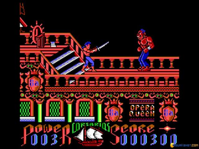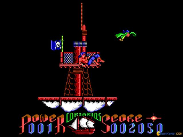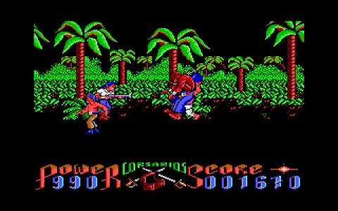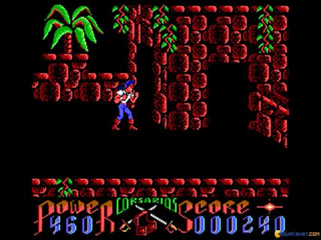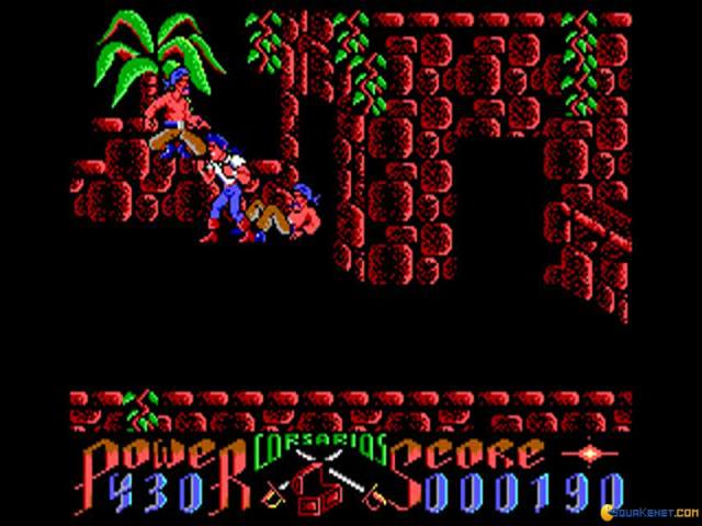 As you might expect from the title, Corsarios is a sea-based adventure which provides a fair amount of swashbuckling action and which turns out to be a surprisingly enjoyable excursion into the life of a pirate. There are two distinct sections to the game, the first of which finds the player stranded on that classic staple of pirate stories, the desert island. The task here is simply to face seemingly endless waves of vicious and brutal pirates who have little more on their minds than the savage death of the player character and who are armed with a nasty array of weapons, including sabers and blunderbusses. Of course, they don't have it all their own way and a swift punch or kick to the head puts down even the most aggressive opponent. If you can survive long enough, you track down a boat at the edge of the island and manage to make your escape. The second part of the game sees you aboard a mighty galleon and which again sees the classic concept of the damsel in distress brought out to play. Gameplay is similar to the previous section but subtly different in that you now have access to a sword and must make your way up the ship's masts in order to rescue the girl and save her from ending up as shark food. Corsarios is undeniably simple stuff, with much in common with scrolling beat 'em ups like Double Dragon and Renegade but when you're in an undemanding mood, it provides ample entertainment. The game's biggest draw is its graphics, which are lovely and chunky, with some gloriously garish environments and sprites to enjoy. Sound fares less well but this is easily ignored, while the gameplay is straightorward but strangely satisfying. It's not a classic fighter but Corsarios is worth a look if you like this kind of thing.