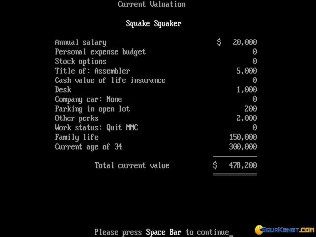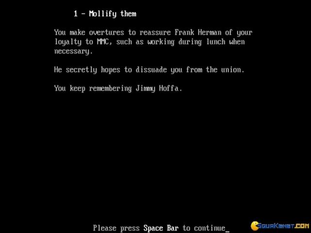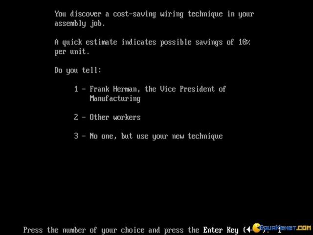 Life is cruel, and being nice gets you nowhere. That's basically what this game is trying to tell you in its own, unique way. And there is no better place to prove that thesis than in the business department. This game is about that. The main objective of this game is to climb the corporate ladder and become CEO of the company you work for. Many times you will be presented with various situations and you have to think carefully about your decisions, because they will take you either to your doom or rise. Your morals will definitely be questioned to the limits, and soon you will find out that being nice really doesn't pay off. The business world is a sea of sharks, and you are a lone swimmer. You have to tough through it for a while and after that your work will be evaluated and you will either remain at your position and lose, or advance and continue to be CEO. The game is pretty original, and an interesting and trustworthy life adviser. There is nothing special to be said for the game's visuals and audio, since the game is very old and both are really vintage and simple. Still, this game is a pretty reliable and nice way for you too see how you would handle yourself in the real life business world. For similar games, try Business Simulator.