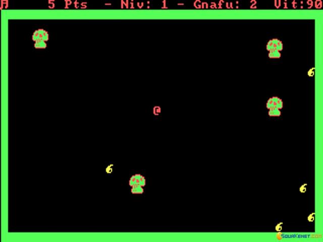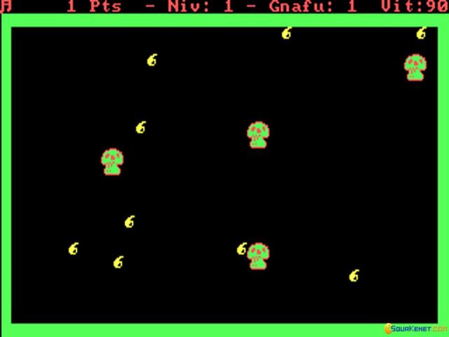 The rather bizarrely named Gnafu is an unoriginal take on the classic Snake-style game that offers little in the way of either innovation or visual flash and which thus ends up being little more than a pointless time waster which is best avoided. If you've ever played Snake on your mobile phone or checked out something like Centipede, you'll know exactly what to expect from Gnafu and this is perhaps the most disappointing aspect of the game, that it adds almost literally nothing new to the genre. The goal as ever is to control your little caterpillar and move him around the screen, gobbling down cherries while avoiding mushrooms and walls. Chomping on the cherries causes the caterpillar to grow in length and if you manage to grab them all, you move on to the next randomly generated level where the whole process is repeated all over again. Like other arcade classics, such as Pacman and Space Invaders, it's little more than a pure exercise in high score attainment and if you enjoy the purity of such a quest, there may be some enjoyment for you here. There's nothing overly wrong with Gnafu that can't be forgiven due to its age, such as weak, uninteresting graphics and sound, while the controls are as responsive and intuitive as you could hope for and which make the game a breeze to play. It is certainly fun to play when you're in an undemanding mood but as with all the other clones of classic hits like PC Man and Acid Tetris, it's hard to recommend Gnafu simply because it rides on the coattails of others without bringing anything new to the table.