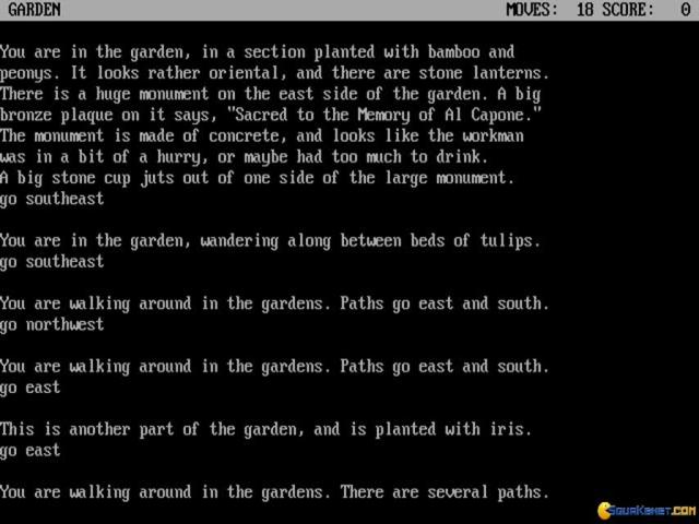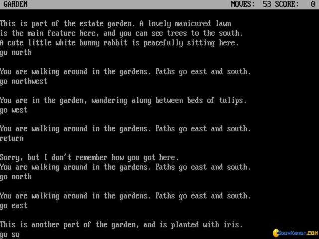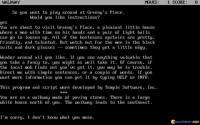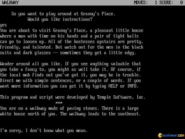 While the advent of graphically explicit sex ridden games was well in its infancy but still well developed, the text based adventure with naughty stories hadn't really cleared the stage yet in the beginning of the 80s. Granny Place is a lesser representative of what text based sexually themed adventure games were about in the era. The game doesn't want to tell an overarching story, instead it focuses on a number of unconnected scenes. Each repartee is filled either with lewd remarks or ridiculous text based puzzles, but also with some jokes which feel kind of sleazy and not too well thought out. Thus it is safe to say that Granny Place is no discovery and that you won't really miss on much if you skip it. The very nasty and incredibly stiff parser won't help either, so if you insist on playing this thing better find a good walkthrough, though, honestly, this game is better left in the past. If you want a better adult themed adventure there are loads of them which also feature graphics, so just from the top of my head I'd suggest trying any game in the Immoral Study series or a game like Girlfriend if you like older style adult adventure games.