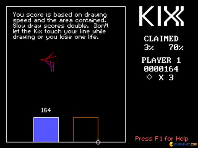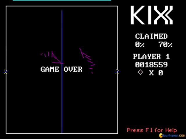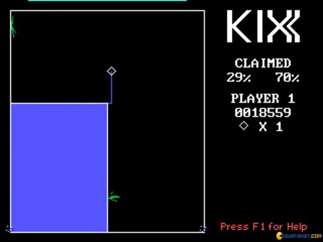 Kix is a well produced, well polished game, that has all the elements that you'd love to see in such a game; it has the backgrounds that you have to cover and claim, it has the little enemies that you have to avoid and the boss enemies that take special care and attention to build your claiming around them. Graphically, even if this game was released in 95, its style and art direction tends to be a little mid 80ish looking. The enemies for instance are made out of lines only, but their animations are cool, as they look like some sort of computer glitches! There are sufficient levels to go through, and while it would have been cool to be enticed by some additional backgrounds to uncover, Kix is nonetheless alright looking and sufficiently diverse as it is, and it gives you enough reason to play. And, overall, Kix is also a low resource game, and you can have it around at any time, when you need a few minutes to take the stress for a walk! Another cool game of the same gameplay mix is Strong Lines, similarly Spartan graphically, but nonetheless, well polished, well produced and exciting to look at. So, have them both in your collection. They're worth it, for sure!