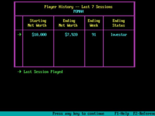 Millionaire Release 2 is the second installment in a serious business simulation series. This second installment released back in 87 doesn't concern itself with graphics, as much as it does with the additional processes and controls that want to make the game even more challenging, or rather true to life. Effectively, you will be trading on any of the 15 available stocks, on any of the 5 difficulty levels. Play the easier ones if you're just familiarizing yourself with the game, otherwise you'll be hemorrhaging money like crazy. Also, each level of difficulty adds a new parameter to the game rather than making the competitors more greedy or more unfair, which is kind of nice because the game increases in difficulty in terms of the number of controls you must be aware of an have at your disposal. Also the game throws in nice spreadsheet like additions so you can view your progress as you need to, plus an assortment of visualizations that make more sense in the game for certain decision. Overall, you won't emerge a ready to broker broker out of the game, but you'll get a deeper understanding of the tidings of high stakes investment, at least as it was conveyed of back in the late 80s. Strictly for trading simulation fanatics or for those that don't mind crunching numbers, otherwise the game can be quite a bore!