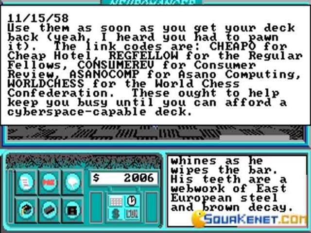 Neuromancer is a computer adventure game (like Matrix) released in 1988 by Mediagenic and it is loosely based on the novel with the same name by William Gibson. It is set both in the real world and the world of cyberspace from the game. The game is set in future Japan, and you play the protagonist who needs to find out the truth about the dissapearance of his friends and some other people and you have to go to cyberspace, because thats where they are lost. You get into the cyberspace via a brain jack you have on the back of your head. The game is part 2D and part 3D. The going around town part is 2D, with a point and click game play. When you get into cyberspace, the game goes 3D. If you try to widen the range of access areas in the cyberspace, you will have to engage into combat, something like breaking the defenses of that area. You kill the blocking entity by sending software which are sort of a energy ball, eventually frying it, and the entity will try to do the same back to you. The character can pump up his skills and abilities by purchasing so called skill chips that can be inserted in your brain through your brain jack. Something like Neo instantly learning kung fu in the Matrix. The gem of the game, as in most good adventure game, is the story line. But I cant reveal it to you because you will lose part of the thrill that is in the game. The game has okay graphics for that time, and the 3D visuals while in the cyberspace was an achievement back then. There is almost no sound so there is nothing to say about that. Overall gaming enjoyment is very good. It wasnt for nothing that this game is rated as one of the best adventure games of all time.