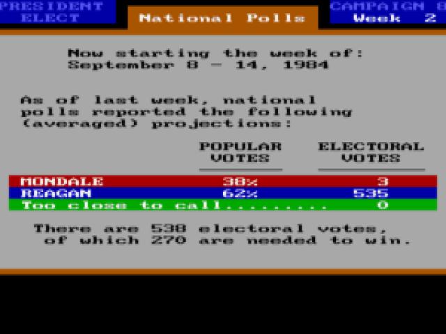 Don't expect to be in an HD super graphical race to win the presidential race in this one game. Instead expect a true text based, simple, full of little weird things kind of sim game, unlike many others. Sure, the 80s were full of weird little sim games, see Alter Ego for a taste of strangeness, but this game here is unique because it simulates the tribulations of trying to make a presidential candidate win the elections. The game simulates the American elections and it does so by having you win the states through presidential trickey also known as campaign! You'll thus have to answer a lot of questions, make choices, make sure you remember what answers you imputed prior and trudge through the question and answer screens while at each stage you'll know whether your options have won you some candidates or not. It reminded me of my first tries to program “interactive†programs using the BASIC programming language that came preprogrammed in my ZX Spectrum clone, and maybe those of you who dabbled in those primitive programming experiences will have some love for this game here. Otherwise I'm pretty sure the presentation will drive you away soon enough!