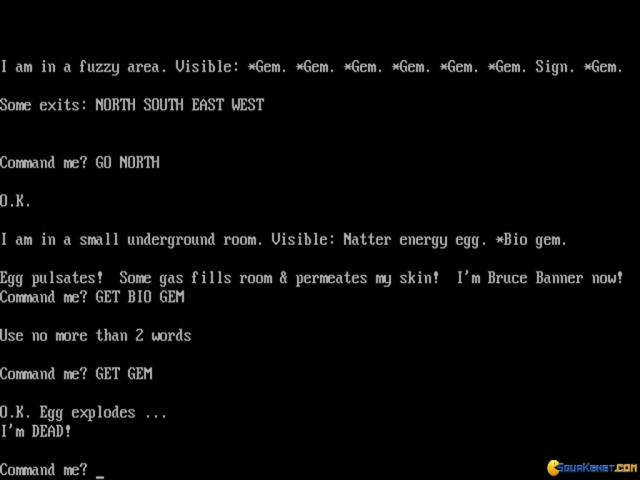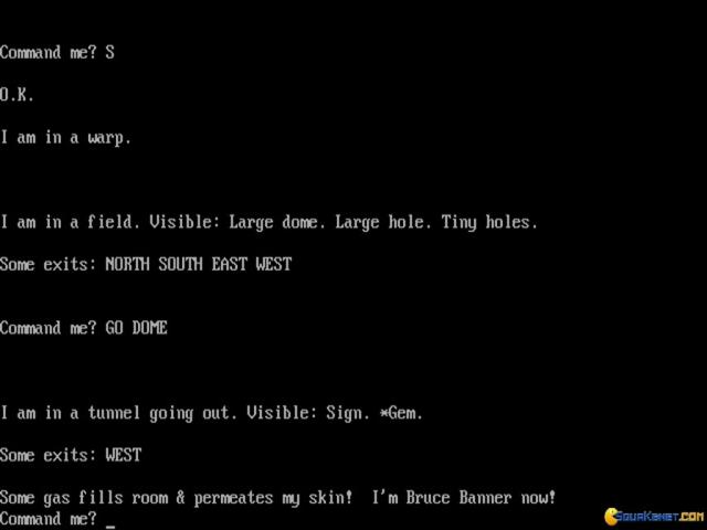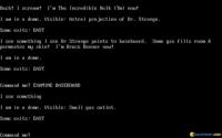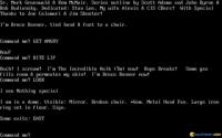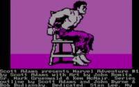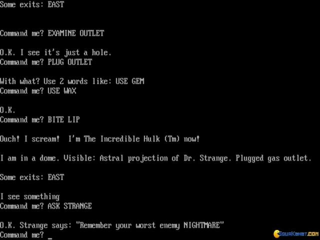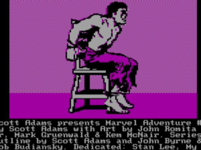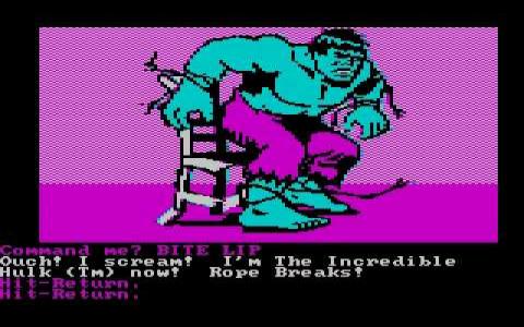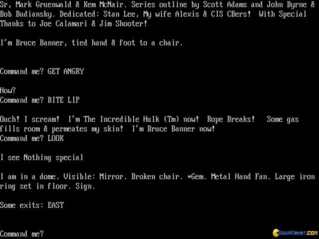 Text based adventures did not miss on the area generally taken up by the graphic novel, that of the superheroes spawn by Marvel and the competition. And this is how Questprobe Featuring The Hulk got on the job, trying to tell the story of how The Mighty Hulk got to be The Mighty Hulk. As such, Questprobe Featuring The Hulk is a game that would fit great in 2013's origins of superheroes stories that the blockbusters (I don't even know if you can still call them that!) have been occupying themselves with. At any rate, what Questprobe Featuring The Hulk is create an average adventure, helped by quite a few slides of non animated pictures (with a very basic minimally colored, and yes magenta is present, graphical aspect!) so that you'll be a bit helped during your adventuring. The puzzles, well, they're there, and you'll giggle a few times at how they haven't evolved in the last 30 or more years. So, well, make sure you're a hulk fan and can stomach adventure games in test mode. Otherwise it's another too old to bother story. Alternatively, see Hulk (2003) for an action oriented game sporting the same green protagonist.