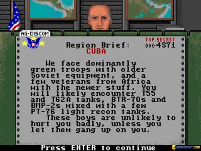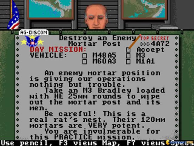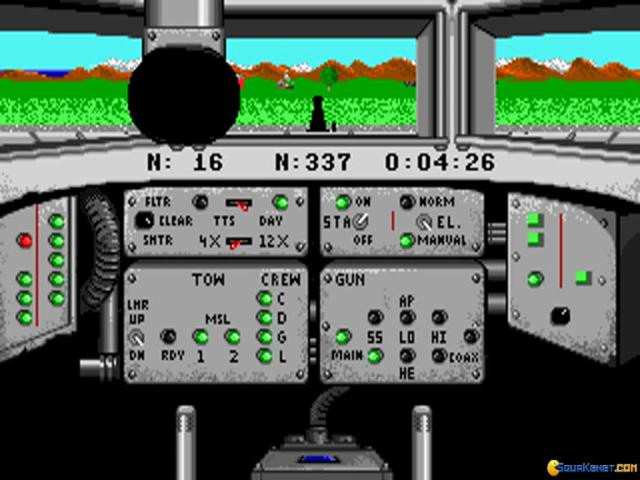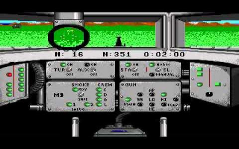 There is without a doubt a lot that is achieved by this game, given that it came out in 88. One thing that will amaze you is the great graphical presentation, both of the menus and the layouts as well as the tank simulation bits. You control your tank from inside the cabin, and have just a strip of visible land available, but then again, this is more than enough to know where you are and where you need to be at. Also, the instrument displays are all live and show genuine information and you should use them. Also, for a more tactical overview of the map you can also take a peek at the overhead map, which will show you your objectives and you can start plotting your way on the map. From the tank you can see faux 3D outlines of enemy tanks and can go on to fixing your cross hair on them, if the mission is to destroy them. Even the sway of the tank as it is moving is simulated, so you won't have it easy acquiring a target when the tank is on the move, a realism adage that is really welcome. Fans of tanks, and fans of oldschool simulations are going to love this, but, again, you're going to need to accept its more primitive graphics, though, for its time and technology this is one of the better games in this genre. Alternatively, you can check out M1 Tank Platoon a more recent game, very enjoyable, but one that has nothing on the complexity of Steel Thunder.