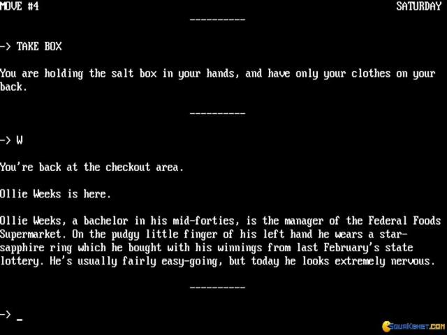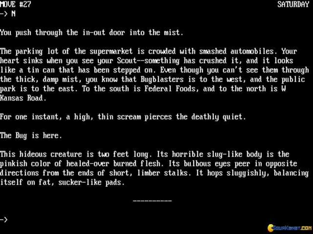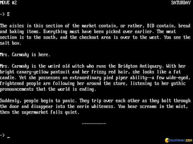 Stephen King managed to become a much respected, loved and actually read writer, though a lot of people wanted to talk him out of a career in writing. But, his love for the form preceded and he soon (and by soon I mean a good couple of years!) began to be successful. So much so that his writings, novels and stories began to find themselves retold as games, as pictures and even as board games. Well, Stephen King's The Mist, as the name suggests is a retelling of his short story in interactive, text based form. I guess, actually reading the piece, which shouldn't too much time will give you an inside into the adventure, so, do give it a search online, but don't expect the game to follow the story very closely. Though, sure, it does not betray the story, but then again, on order to make it more interesting there had to be some alterations made, though nothing substantial. The puzzles that are included mostly make sense in the larger scope of the story, but don't expect them not to pop out, they will. I for once loved it. So, if you like such darker, mystery endowed games, see The Lurking Horror which is a lot more titled towards horror but a fun playthrough as well.