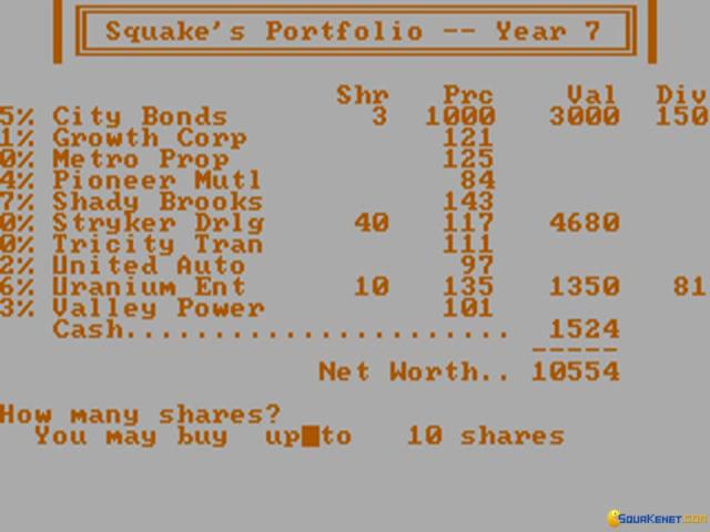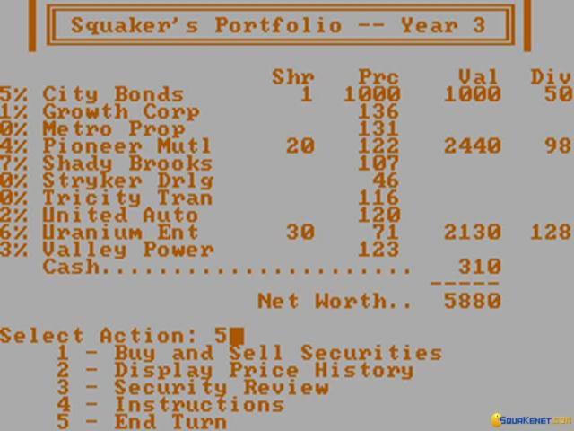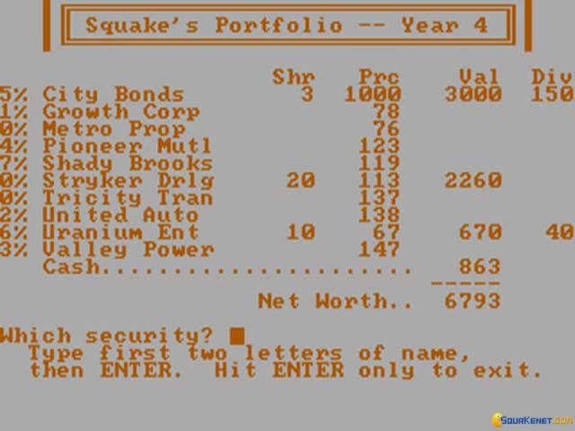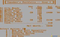 Stocks And Bonds is a tabletop turn based stock market simulation, which allows you to trade from the 10 securities available. You start the game with a measly 5000 dollars but if you trade carefully and take risks you too can become a very successful trader. The game plays in turns and each turn represents one full year of stock exchanges. From this point of view, Stocks And Bonds is not that very detailed, but then again, there isn't a limit on how many years you can go on and do deals. You can play against the PC or you can play with (against) 7 other human players. A few nice touches in the trading are included, such as the hype that surrounds the Black Friday as well as the inclusion of the Happy Monday, all staples of oldschool (and even present) trading periods. Graphically we're talking about a game coded in BASIC, so don't expect too many bells and whistles, but for what it's worth, Stocks And Bonds looks alright, as the information is neatly presented on screen. So, if you'd like to try a very old stock broker sim, Stocks And Bonds can be it. Additionally, download Stock Market - The Game, still from the infancy of the genre, 87, but nonetheless well produced.