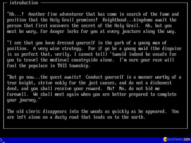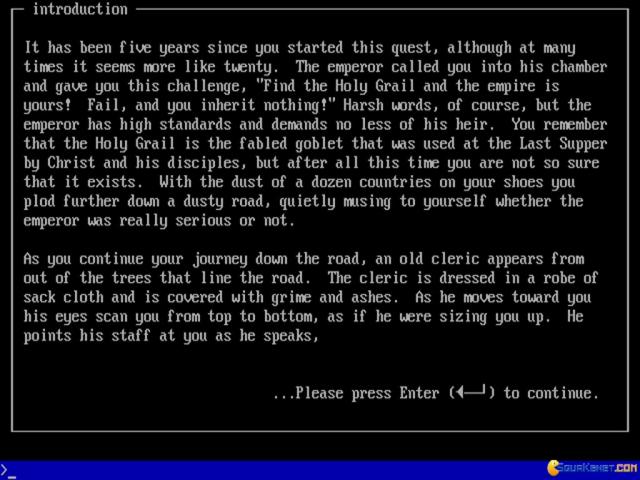 The Holy Grail is a parser text adventure, that sets you on a journey, as if you were the mighty Indiana Jones in Indiana Jones and the Fountain of Youth, the well done fan made adventure. Sure, enough, The Holy Grail loses a lot in terms of technical presentation. You can barely type in anything other than the preordered commands that the developers put in, and even then, I'm afraid, the game doesn't seem to have the internal logic or the ordering of sequences that would best make sense. Sure enough, the game won't ask you to participate in too difficult a bunch of tests and tasks, which, fortunately is pretty well for this one, but nonetheless, if you ca disregard the parser problems, you'll find the game to be pretty alright. Sure, it sure could have been much better, and maybe, a few additional visual cues here and there would have been well deserved, but, well, there's no reason to cry over spilled milk. So, if you're not an avid text based fan, better avoid it. Download the Indi game I've linked to above and you'll be more satisfied.