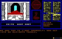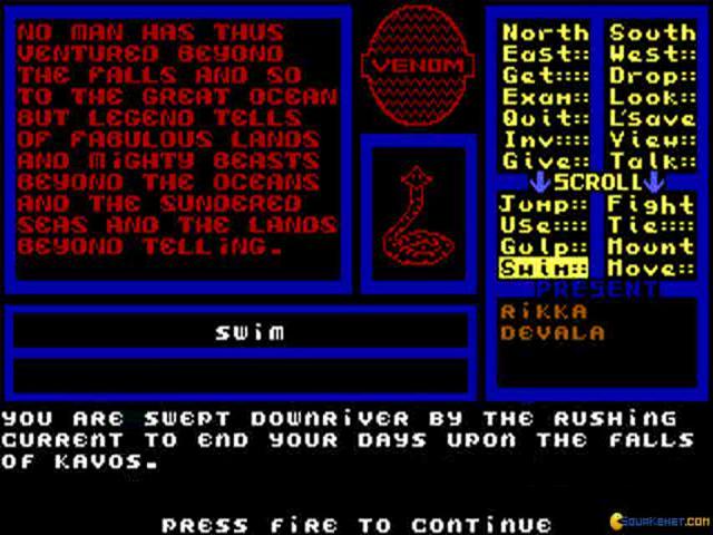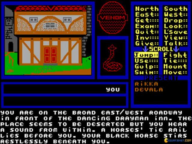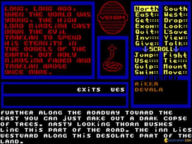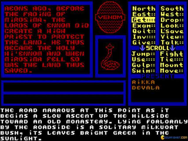 The interactive fiction genre is one packed with classics that really show off the power of the printed word, with the likes of Zork, The Mist and The Pawn standing up well today. Venom falls into the category of the text adventure which also features graphics to add atmosphere to proceedings and while it may not be a classic of the genre, it stands as a solid if uninspiring entry. The plot is a fantasy-style story, set in a world where the evil Traklan is about to arise once more, after having been supposedly consigned to eternity underground by the legendary lord Mirosima and who now seeks revenge for his imprisonment. The player takes on the role of Rikka, a close chum of the current king and who happens to be a dab hand with a sword, which is going to come in handy in the coming adventure as you seek to prevent Traklan's return. Venom makes use of a simple enough interface which handily lists all the available commands in a window and which makes navigating the world a relative breeze. This makes the game quite accessible to genre newcomers and Venom does actually make for a good, if unspectacular, introduction to this type of game. The visuals are simple enough and although they aren't as impressive as those in Guild of Thieves, they add in some much appreciated atmosphere which helps to bring the game to life. The text and narrative are generally well written enough and the story as it unfolds is quite engaging although it won't win any awards for originality. Puzzles too are solid enough, generally being tricky without being frustrating or illogical, so on the whole if you're tempted to dabble in the field of interactive fiction, you could do worse than check out Venom.