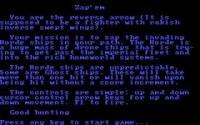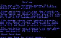 Things really don't get much more basic than Zap 'em, in terms of either visuals, options or gameplay itself but for a neat variation on the classic old-school shooter formula as established by Space Invaders, it's worth a brief inspection. While many shooters which followed in the progenitor's footstep were merely content to copy wholesale from their inspiration, Zap 'em does at least offer a little something in the way of originality and can even be seen as a forerunner to the likes of horizontally scrolling shooters such as Gradius. The twist here is that instead of presenting players with a simple screen with their ship at the bottom and wave after wave of enemies approaching from the top, Zap 'em turns things on the side and positions the ship at the left of the screen, with the enemies coming from the right. It's like a static version of the horizontal shooter and it's a concept which has been used surprisingly little over the years but which is nevertheless an entertaining proposition. Where Zap 'em falls down is in its obvious home-made nature with excessively crude graphics that are little more than an arrow for the spaceship and square blocks for the bad guys. When even the instructions acknowledge the fact that the main sprite doesn't really look like what it is supposed to, you know you're entering amateur hour! Despite these visual shortcomings though, Zap 'em plays reasonably well and if you are the kind of player who enjoys high score chasing and is not put off by the low rent graphics, this might prove to be right up your alley.